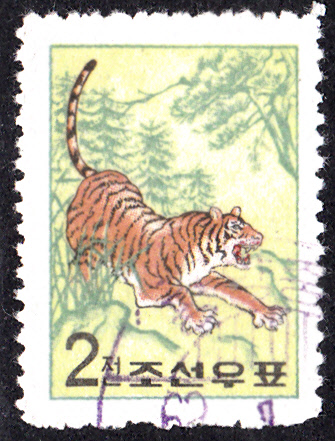 Auf dieser Marke aus Korea-Nord (MiNr 368) wird ein Sibirische Tiger (Panthera tigris altaica) oder Amurtiger gezeigt.