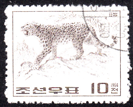 Auf dieser Marke aus Korea-Nord (MiNr 560) aus dem Jahre 1964 ist ein Amurleopard (Panthera pardus orientalis) zu sehen.
