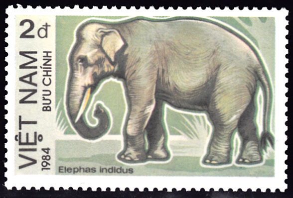 In einer Serie "Geschützte Tiere" erschien in Vietnam auch diese Marke (MiNr 1415) mit einem Indischen Elefant (Elephas maximus).