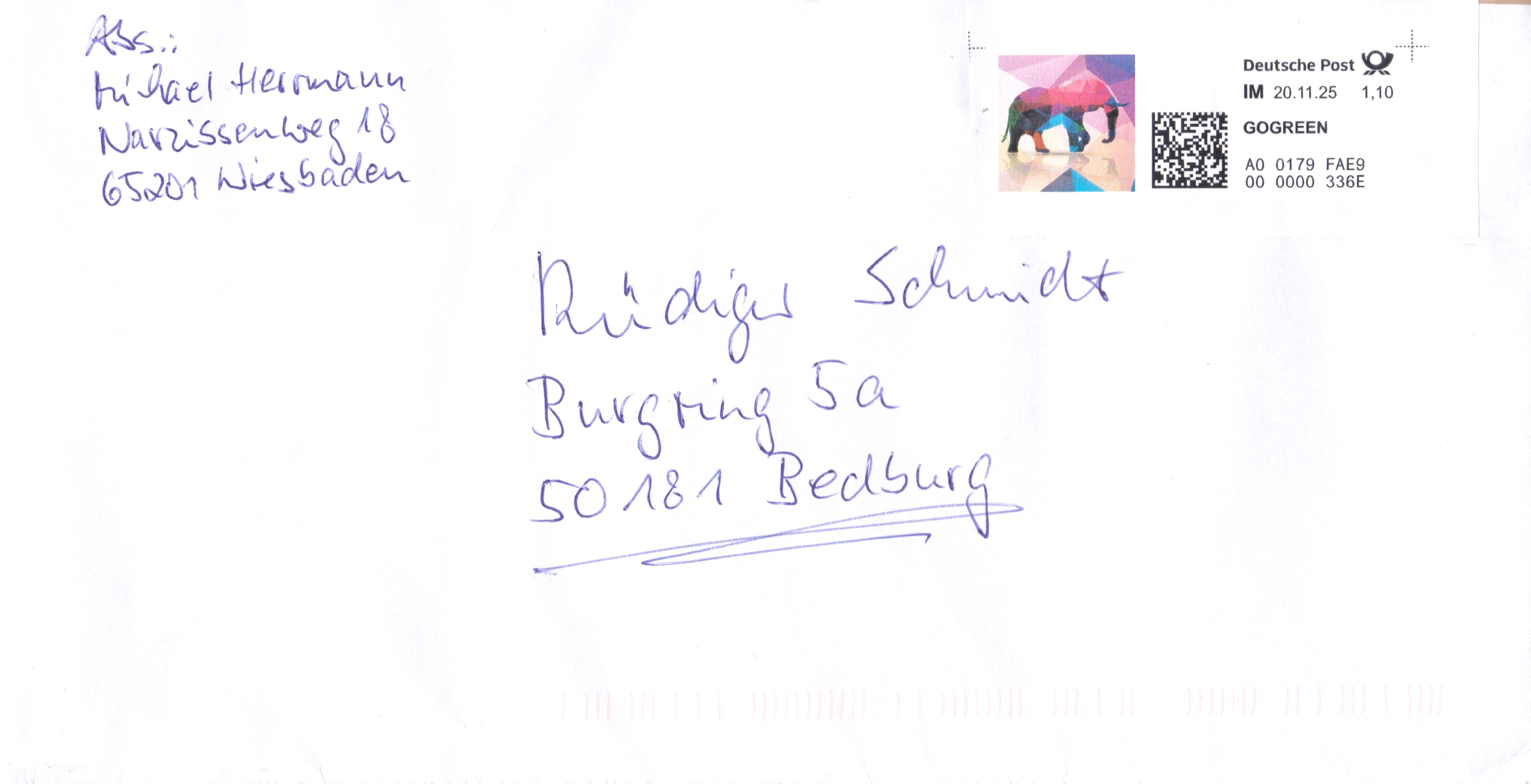 Zur Frankatur dieses Briefes diente am 20.11.2025 eine Internetmarke (= IM) der Portostufe 1,10 Euro mit einem Elefanten als Motiv: