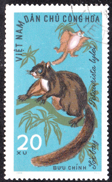 Diese Marke aus Vietnam (MiNr 373) bildet ein Indisches Riesengleithörnchen (Petaurista philippensis) der Unterart Petaurista philippensis lylei ab. Im Michel wird es Riesen-Flughörnchen (Petaurista lylei) genannt.