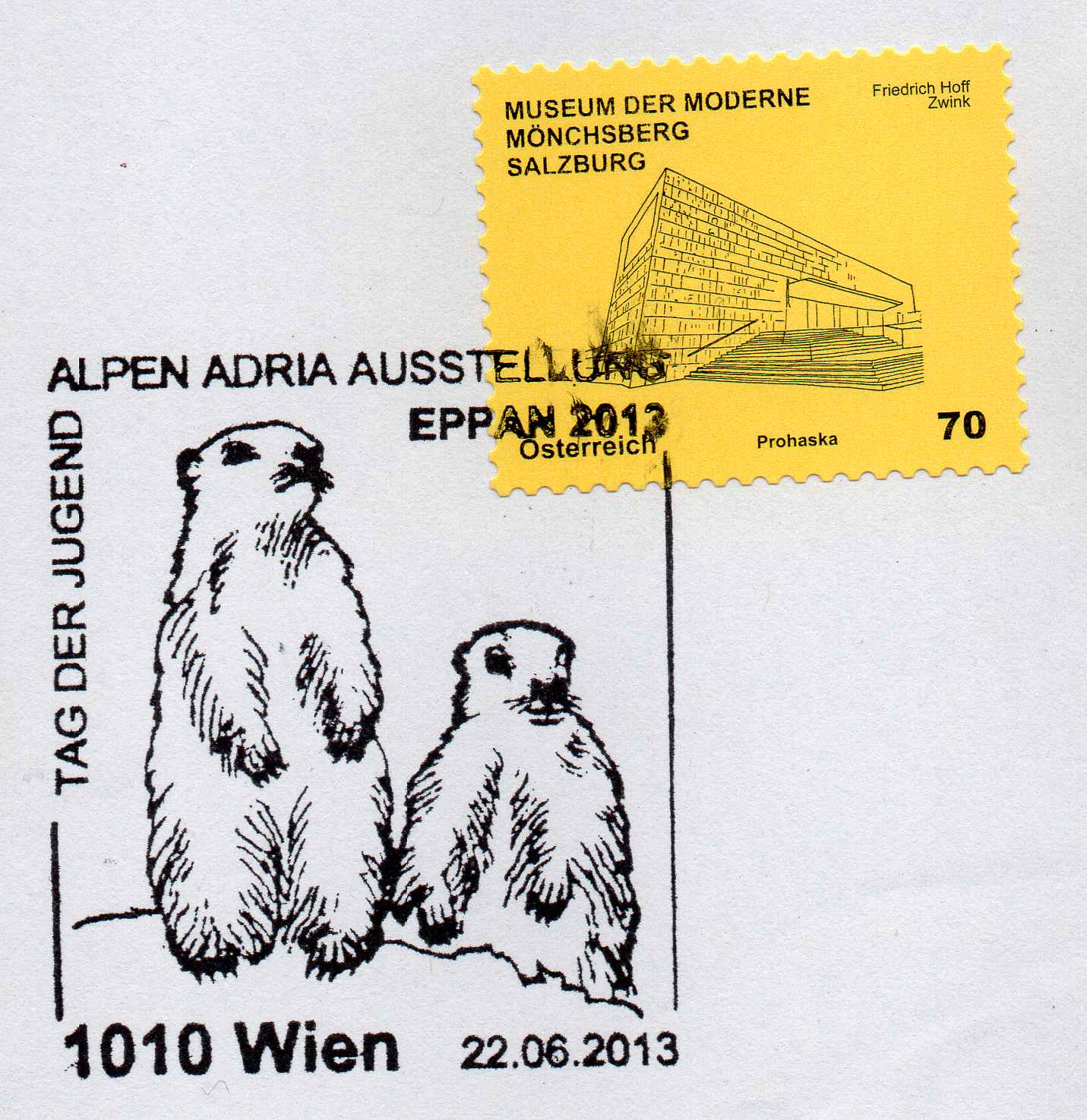 Im Sonderstempel vom 22.6.2013 aus Wien zur Alpen Adria Ausstellung EPPAN 2013 werden zwei Alpenmurmeltier (Marmota marmota) gezeigt.