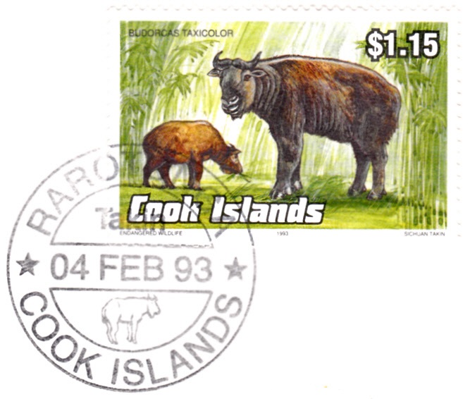 Auf einer Marke der Cook-Inseln (MiNr 1388) aus einer Serie "Gefährdete Tiere" werden zwei Mishmi-Takine (Budorcas taxicolor) gezeigt. Hier eine Marke mit dem zur Marke passenden Ersttagstempel.