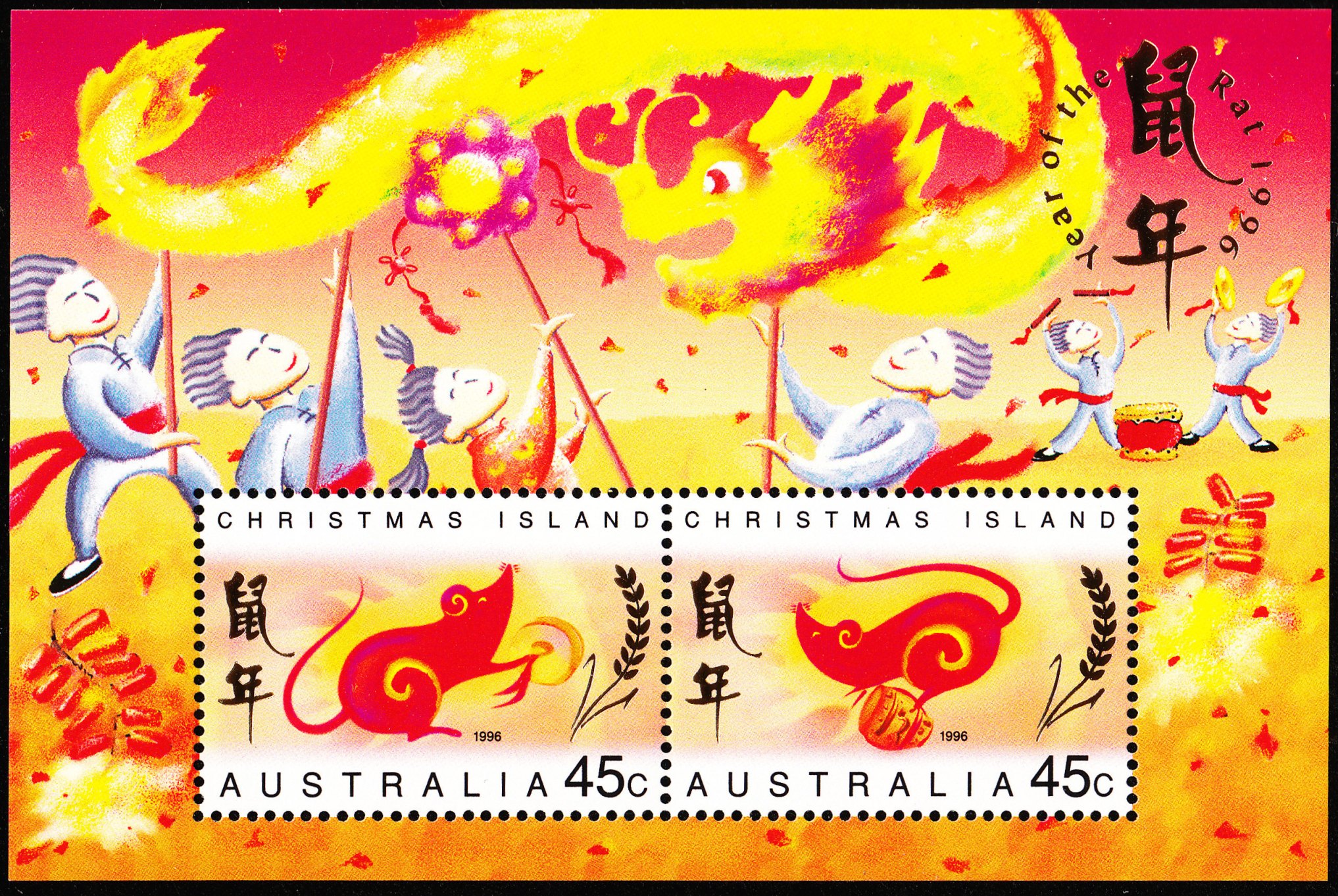 Der Ausgabeanlaß "Year of the Rat 1996" wurde in Golddruck auf dem Blockrand vermerkt, in chinesischen Schirftzeichen auch auf den Marken: