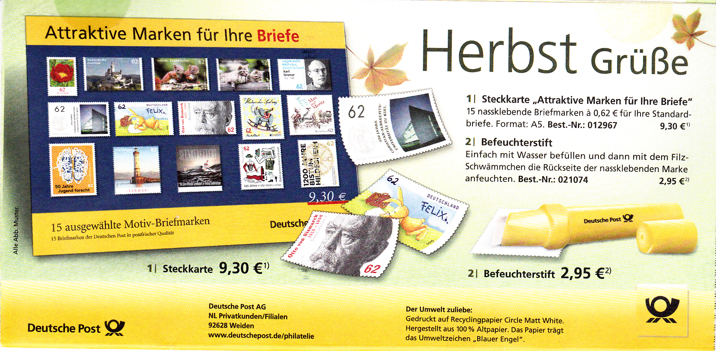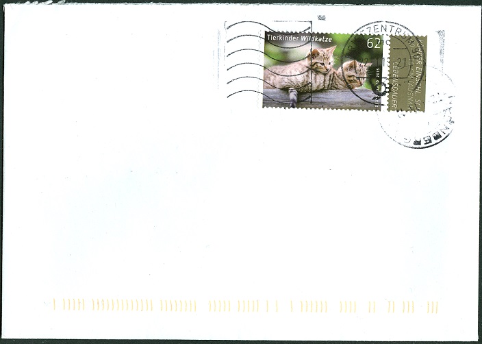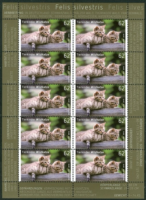 Zum Ausgabeumfang der DPAG am 2.Januar 2015 gehörte ein Motiv "Wildkatze". Die 62 Cent-Marke erschien wie gewohnt im 10er-Bogen. Aber auch als selbstklebende Ausgabe als so genanntes MAXISET.