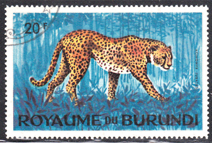 Auf dieser Marke aus Burundi (MiNr 99A) vom 10.2.1964 sieht man einen Gepard (Acinonyx jubatus).