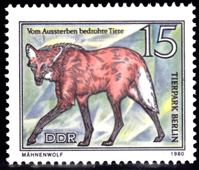 Auf dieser Marke aus der DDR (MiNr 2524) ist ein Mähnenwolf (Chrysocyon brachyurus) aus dem Tierpark Berlin zu sehen.