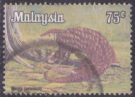 Eine Marke aus Malaysia (MiNr 192) zeigt ein Malaiisches Schuppentier (Manis javanica).