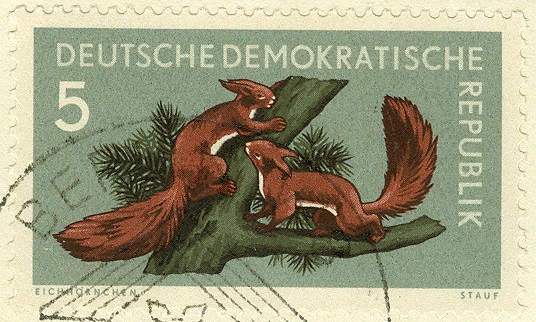 Die 5 Pfennig-Marke der DDR- Ausgabe "Waldtiere" vom 27. November 1959 zeigt 2 vulgäre Eichhörnchen.