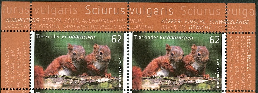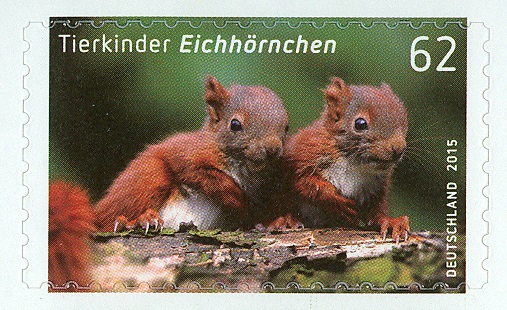 Diese 2015 erschienene Sondermarke zeigt Eichhörnchen im Rahmen der Serie Tierkinder.