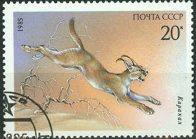 Auf dieser Marke der ehemaligen CCCP aus dem jahr 1985 wird uns ein Karakal (Caracal caracal), oder Wüstenluchs, gezeigt.