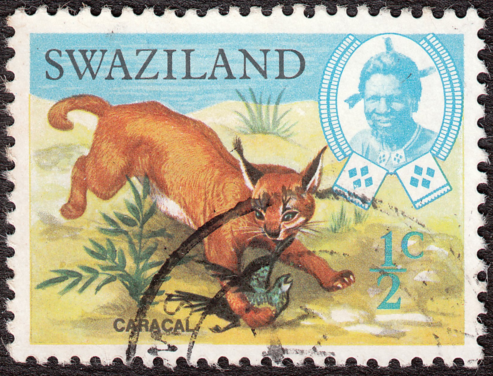 Dieses Postwertzeichen aus Swaziland zeigt uns den Karakal als erfolgreichen Vogeljäger: