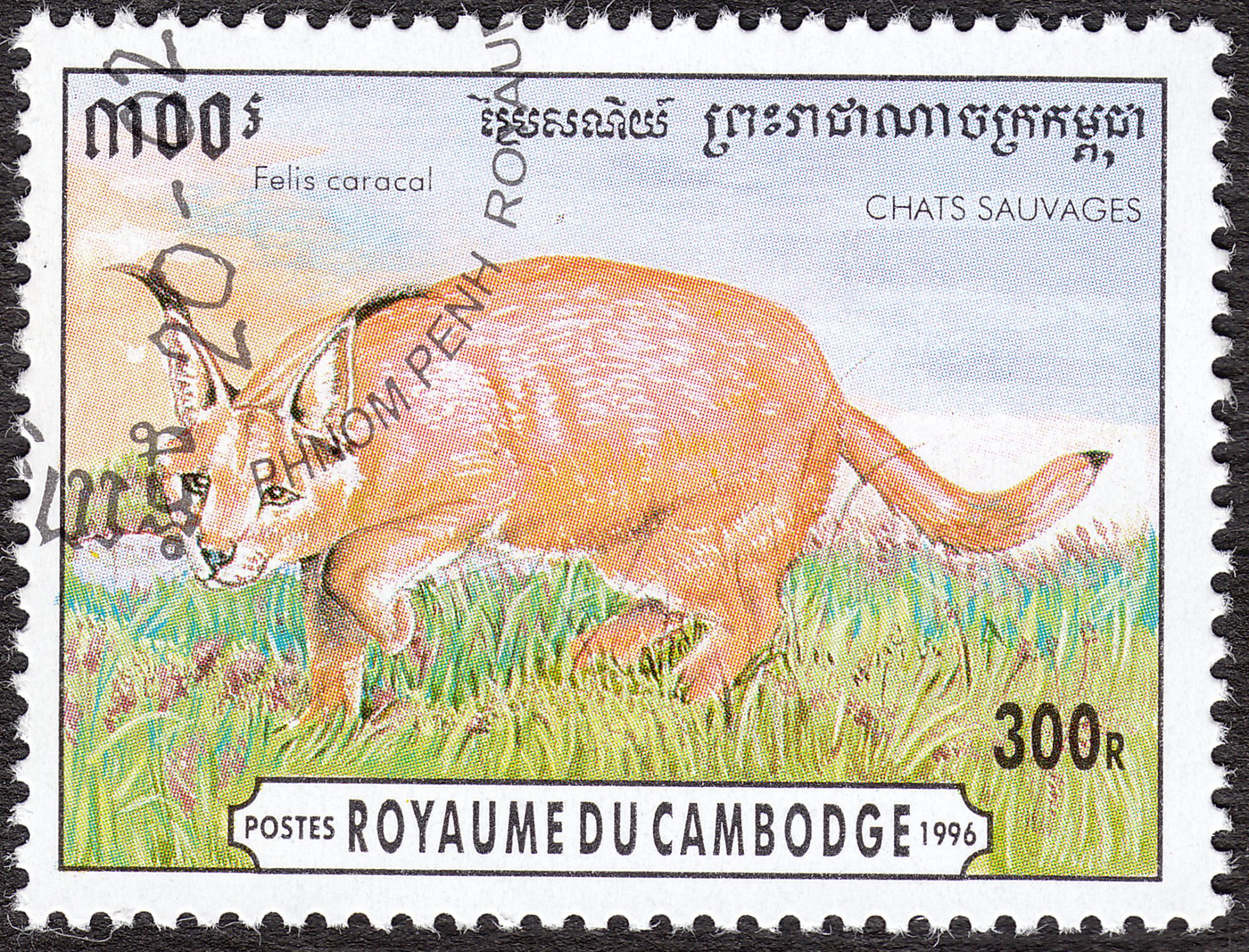 Auf dieser Marke aus Kambodscha schleicht sich ein Karakal gerade an: