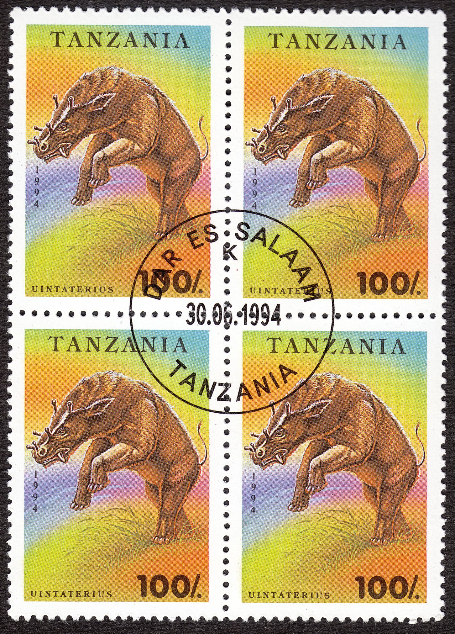 Hier eine zum Motiv Uintatherium passende Marke aus Tansania im Viererblock: