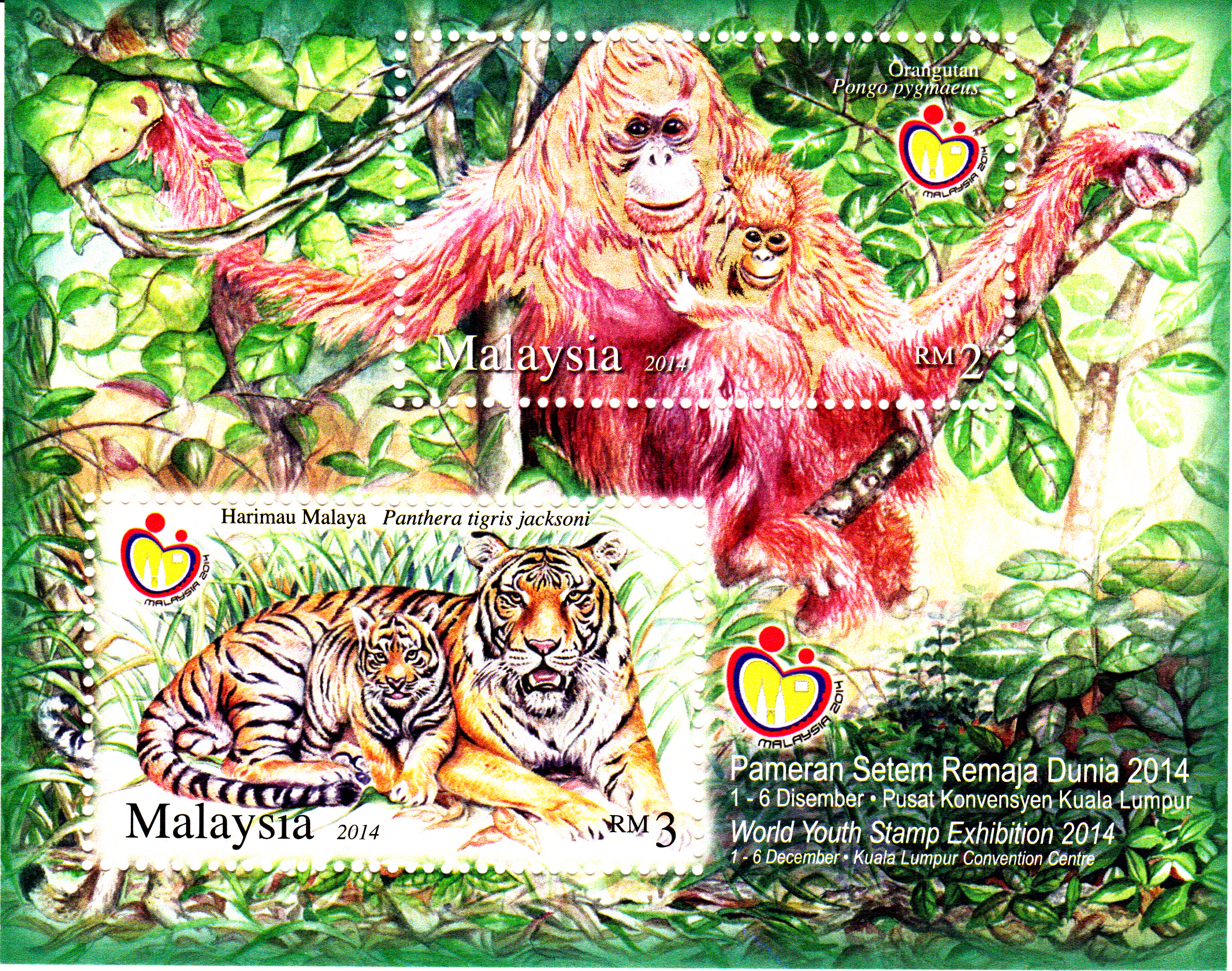 Auch dieser Block zur Malaysia 2014 (MiNr Block 187) enthält eine Marke zu 2 Ringit mit der Abbildung zweier Borneo-Orang-Utan (Pongo pygmaeus). Auf der zweiten Marke sehen wir einen Malaysischen Tiger (Panthera tigris jacksoni).