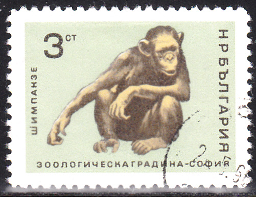 Auf dieser Marke aus einer bulgarischen Serie "Zoologischer Garten von Sofia" ist ein Schimpanse (Pan troglodytes) zu sehen.