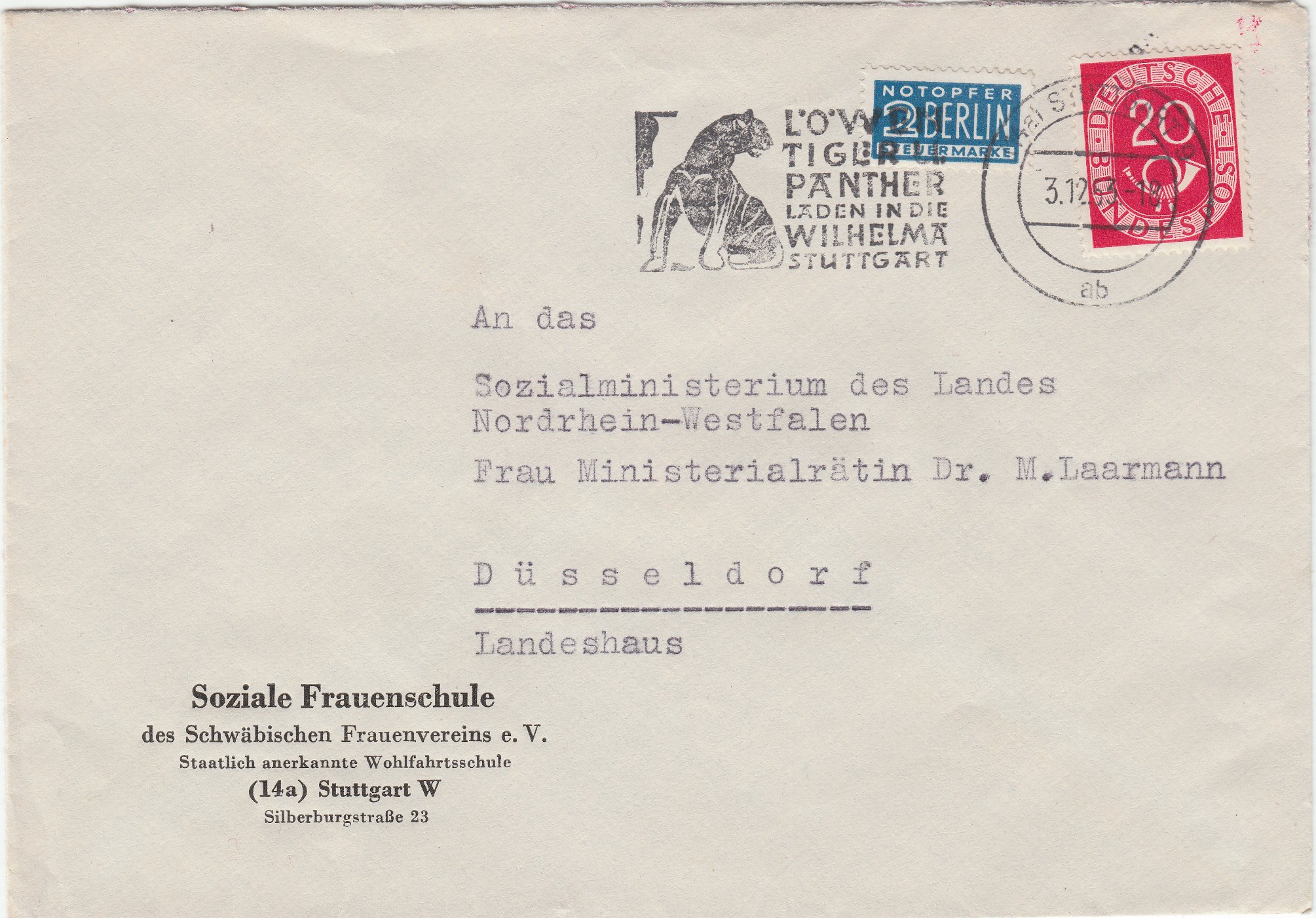 Hier als philatelistisches Beispiel ein Maschinenstempel mit Werbeeinsatz "LÖWEN TIGER U. PANTHER LADEN IN DIE WILHELMA STUTTGART":