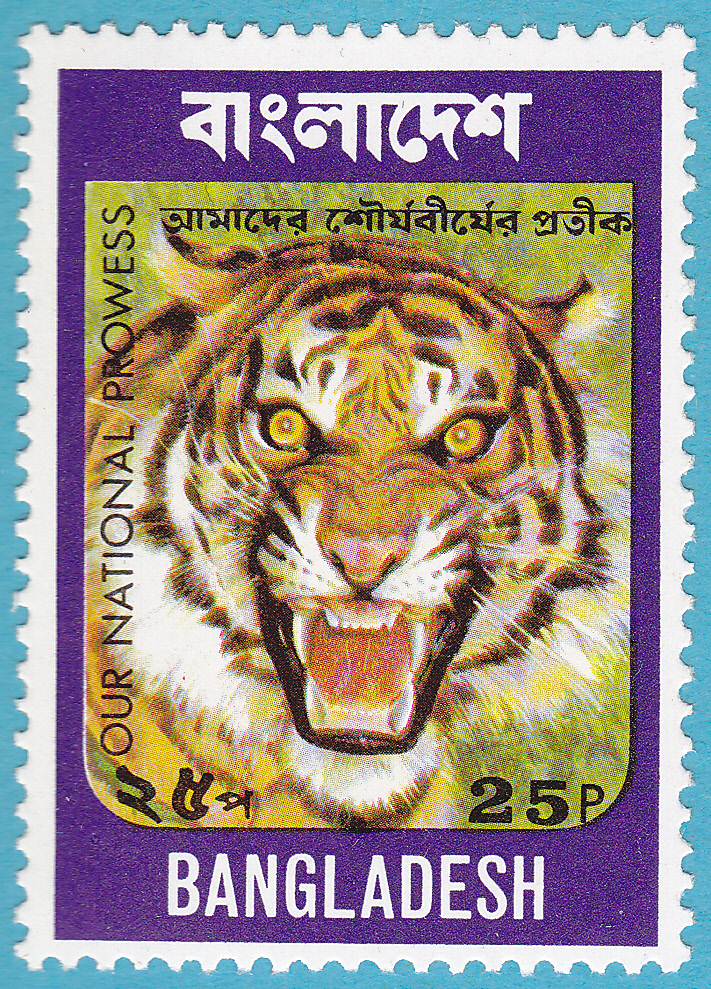 In Bangladesch erschien am 30.4.1973 in einer Dauerserie ein Wert (MiNr 27) mit dem Kopfbild eines Tigers (Panthera tigris), die ich hier abbilde: