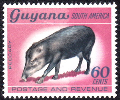 Hier eine Marke aus Guyana (MiNr 312) mit einem Halsbandpekari (Tayassu tajacu).
