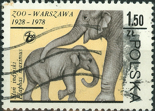 Auf dieser polnischen Briefmarke aus dem Jahr 1978 zeigt die herausgebende Post asiatische Elefanten (Elephas maximus). Anlass war ein Jubiläum des Warschauer ZOOs.