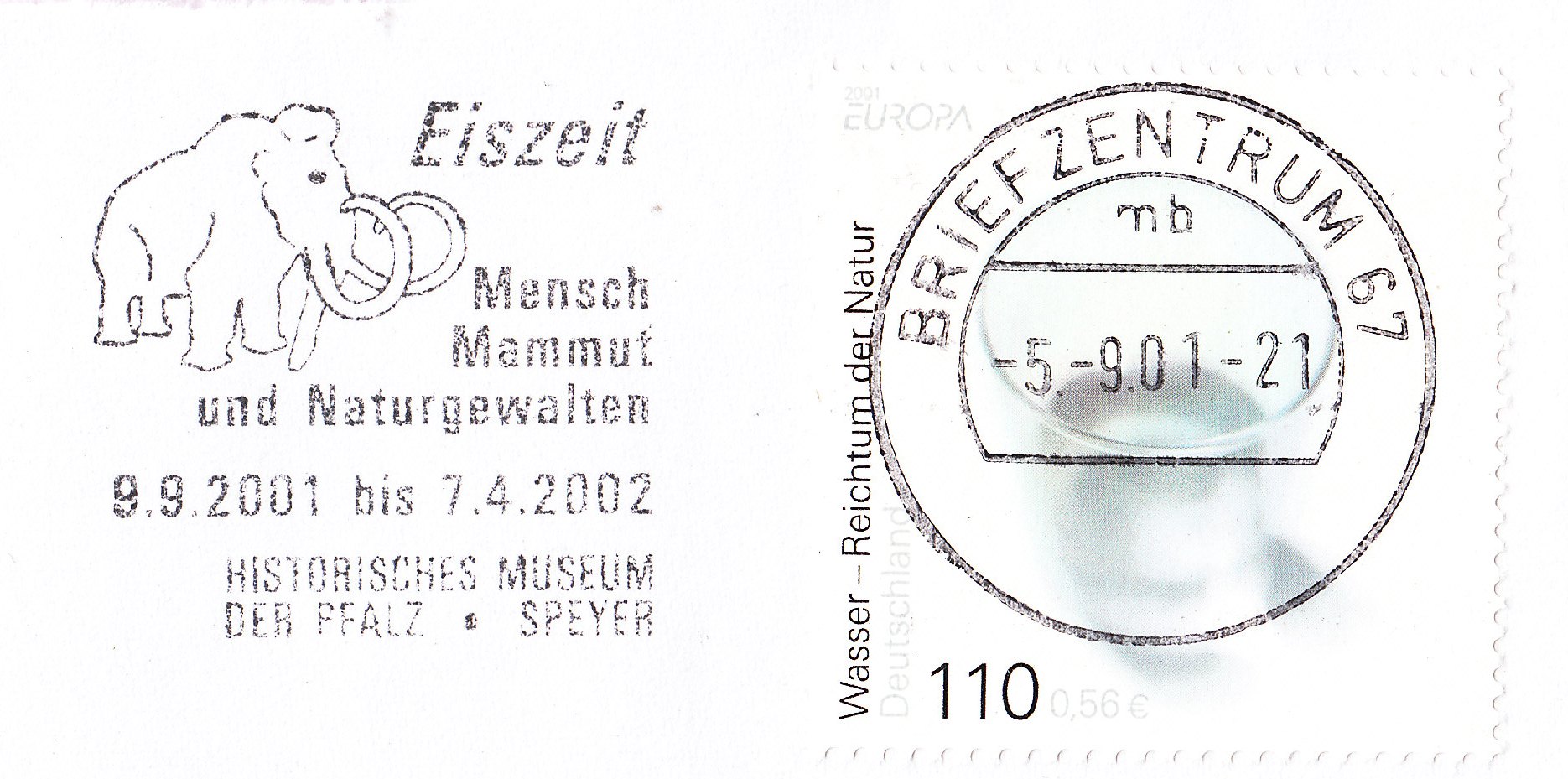 Dieses Briefstück zeigt eine thematisch passende Kombination zum Mammut als in der Eiszeit ausgestorbener Gattung der Elefanten, bestehend aus dem Postwertzeichen "Wasser - Reichtum der Natur" sowie einem Maschinenstempel mit Werbeeinsatz zu einer Ausstellung in Speyer "Eiszeit Mensch Mammut und Naturgewalten":