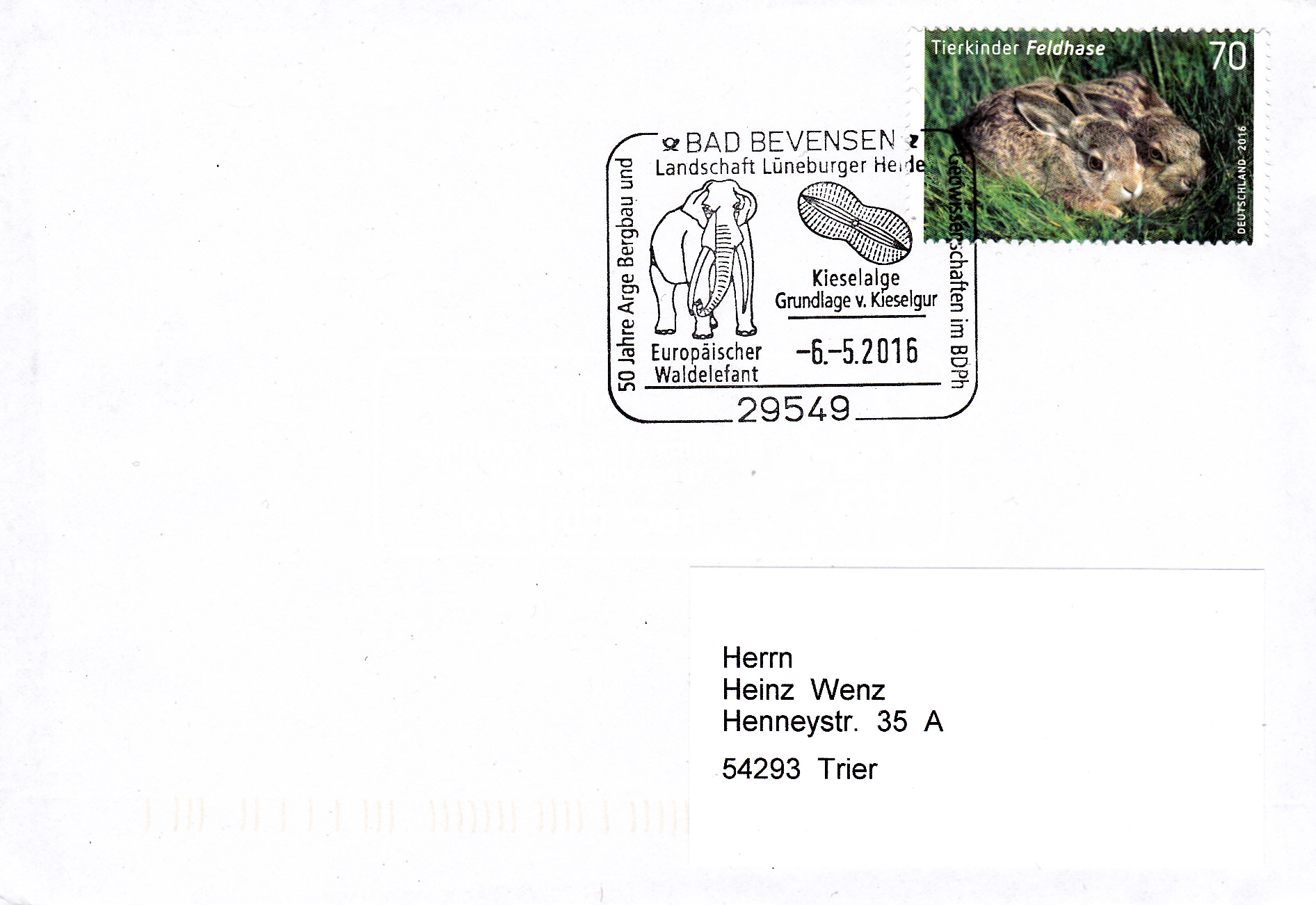 Dieser Sonderstempel aus Bad Bevensen vom 6.5.2016 zeigt im Stempelbild einen Europäischen Waldelefanten.