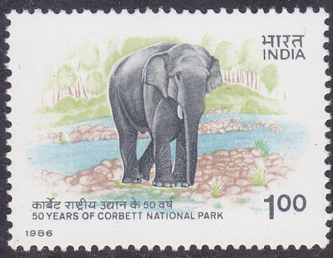 Ein Indischer Elefant (Elephas maximus) wird auf dieser Marke aus Indien (MiNr 1074) zum Jubiläum "50 Jahre Corbett-Nationalpark" gezeigt.