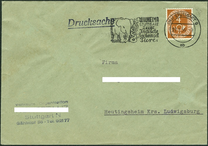 Ein anderer Stempeleinsatz zeigt den indischen Elefanten etwas größer. Diese Drucksache wurde 1954 korrekt mit einer 4-Pfennig-Marke freigemacht.