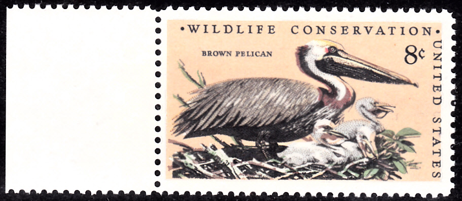 In der Serie "Vögel und Blumen der 50 Bundesstaaten" erschien in den USA eine Marke, (MiNr 1549) die einen Braunpelikan (Pelecanus occidentalis) zeigt. Die Marke gibt es in zwei Zähnungen: A = gez. K 11 1/4 und F = gez. L 10 3/4:11 1/4.