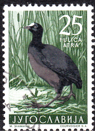 Aus Jugoslawien kommt diese Marke (MiNr 845) mit einem Blässhuhn (Fulica atra).