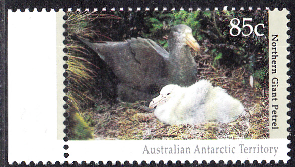 Auf dieser Marke aus den Australischen Gebieten in der Antarktis (MiNr 92) wird ein Riesensturmvogel (Macronectes giganteus) mit einem Küken abgebildet.