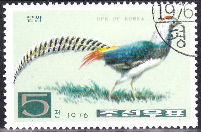 Hier eine Marke aus Korea-Nord (MiNr 1501) mit einem Diamantfasan (Chrysolophus amherstiae).