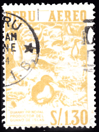 In Peru sind mehrere motivgleiche Marken mit Guanokormoranen (Leucocarbo bougainvillii) verausgabt worden. Hier zeigen ich die Marke mit der MiNr 623.