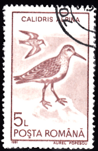 Auf dieser Marke aus Rumänien (MiNr 4649) wird ein Alpenstrandläufer (Calidris alpina) gezeigt.