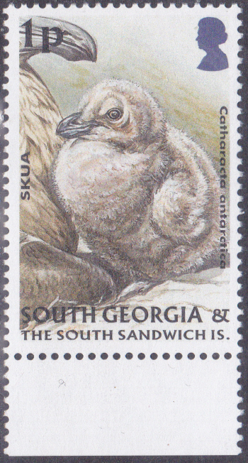 Auf einer Marke (MiNr 390) aus Süd-Georgien und den Süd-Sandwich-Inseln (ein britisches Überseegebiet im Südatlantik) wird ein Jungtier gezeigt.