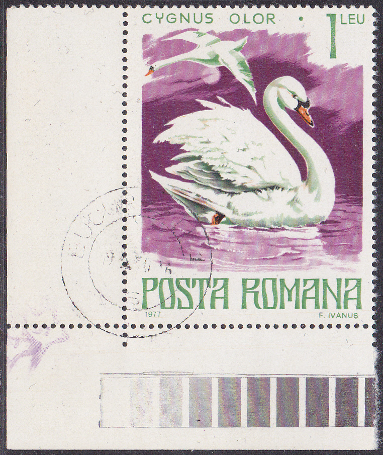 Inneiner Serie "Geschützte Tiere" ist in Rumänien diese Marke (MiNr 3418) mit einem schwimmenden und einem fliegenden Höckerschwan (Cygnus olor) erschienen. Hier ein Exemplar als Eckrandstück.