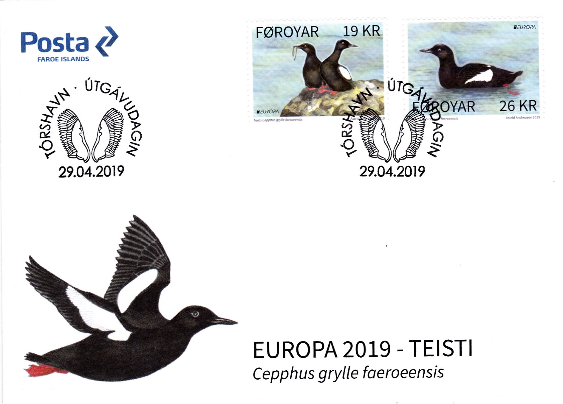 Die zweite Europamarke aus Dänemark Färöer (MiNr 956) zeigt eine schwommende Gryllteiste (Cepphus grylle).