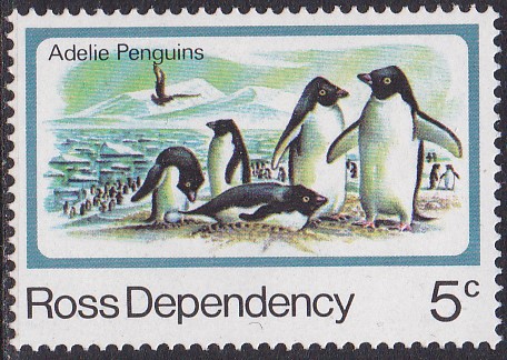 Diese Marke (MiNr 15) aus dem Ross-Gebiet (Das Ross-Nebengebiet ist der von Neuseeland beanspruchte Anteil an der Antarktis) bildet Adeliepinguine ab.