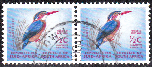 Auf dieser Marke aus Südafrika wird ein Zwergkönigsfischer (Ispidina picta) gezeigt. Michel nennt ihn Zwergeisvogel (Ispidina picta). Hier zeige ich ein waagerechtes Paar der Marke.