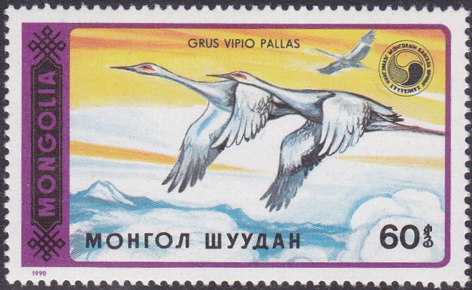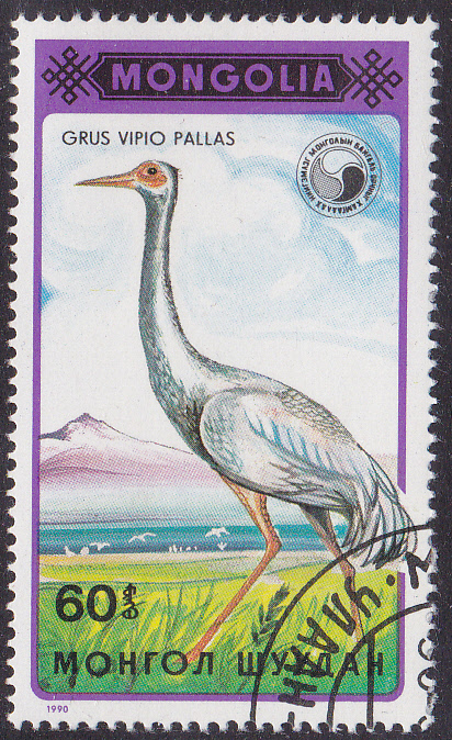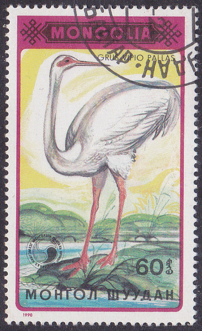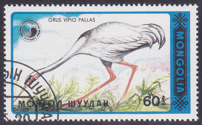 in der Mongolei ist eine Serie mit Weißnackenkranichen (Grus vipio) erschienen. hier die erste Marek aus dieser Serie (MiNr 2137) mit einem Weißnackenkranich (Grus vipio) an einem Ufer.