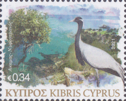 Diese Marke aus Zypern (MiNr 1461) zeigt einen Jungfernkranich (Anthropoides virgo; Syn.: grus virgo) auf der Halbinsel Akamas.