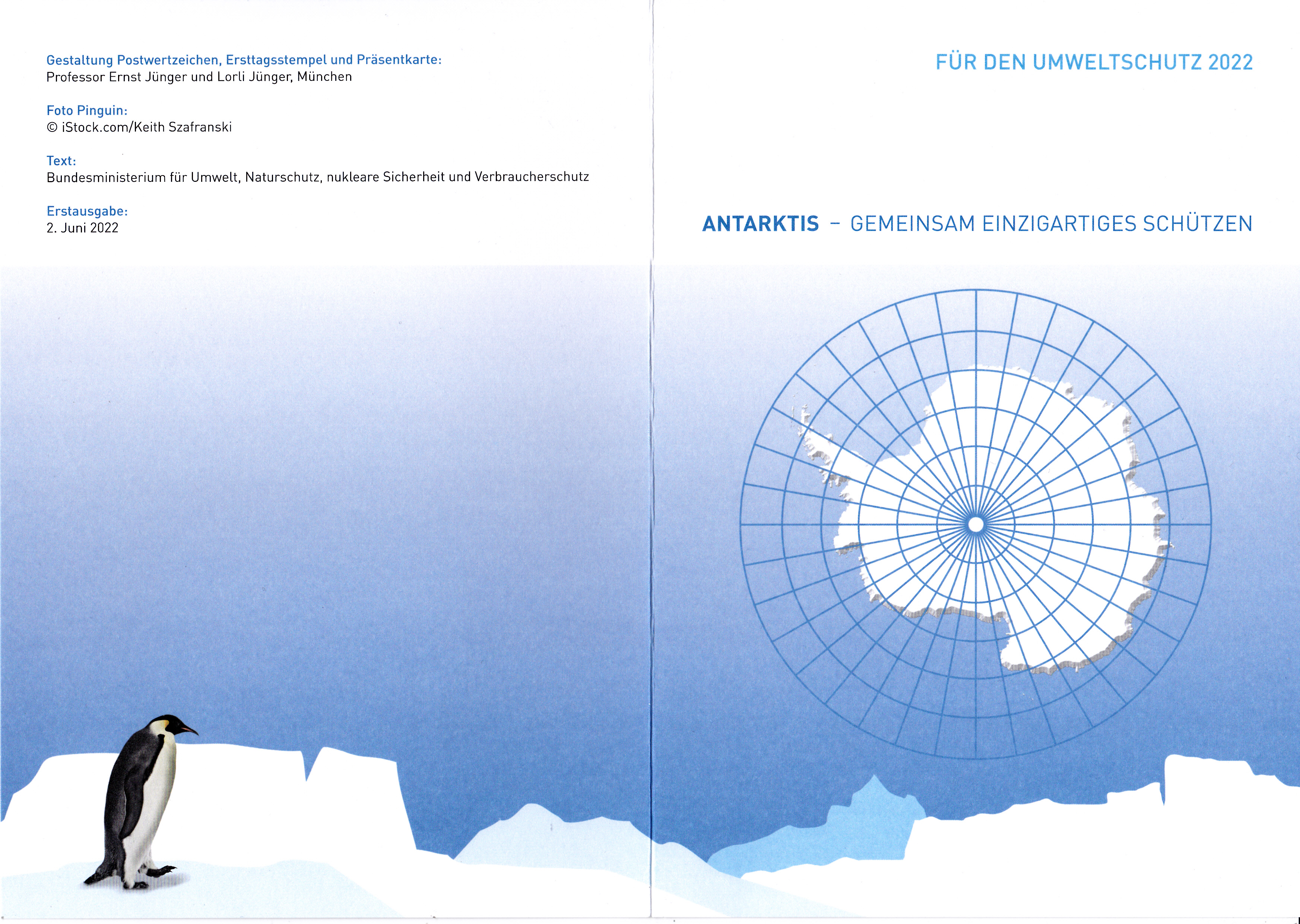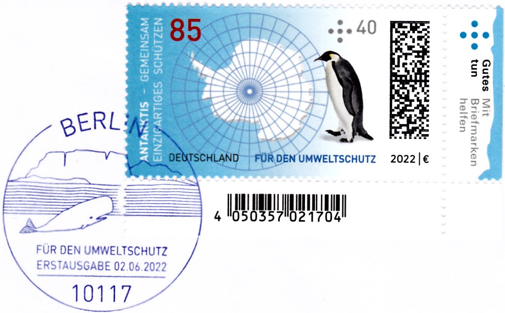 Die Marke "Umweltschutz" 2022 der Deutschen Post steht (MiNr 3689) unter dem Motto "Schutz der Arktis" und bildet eine Karte der Antarktis und einen Kaiserpinguin (Aptenodytes forsteri) ab. Ich zeige hier ein Eckrandstück mit EAN-Codierung.