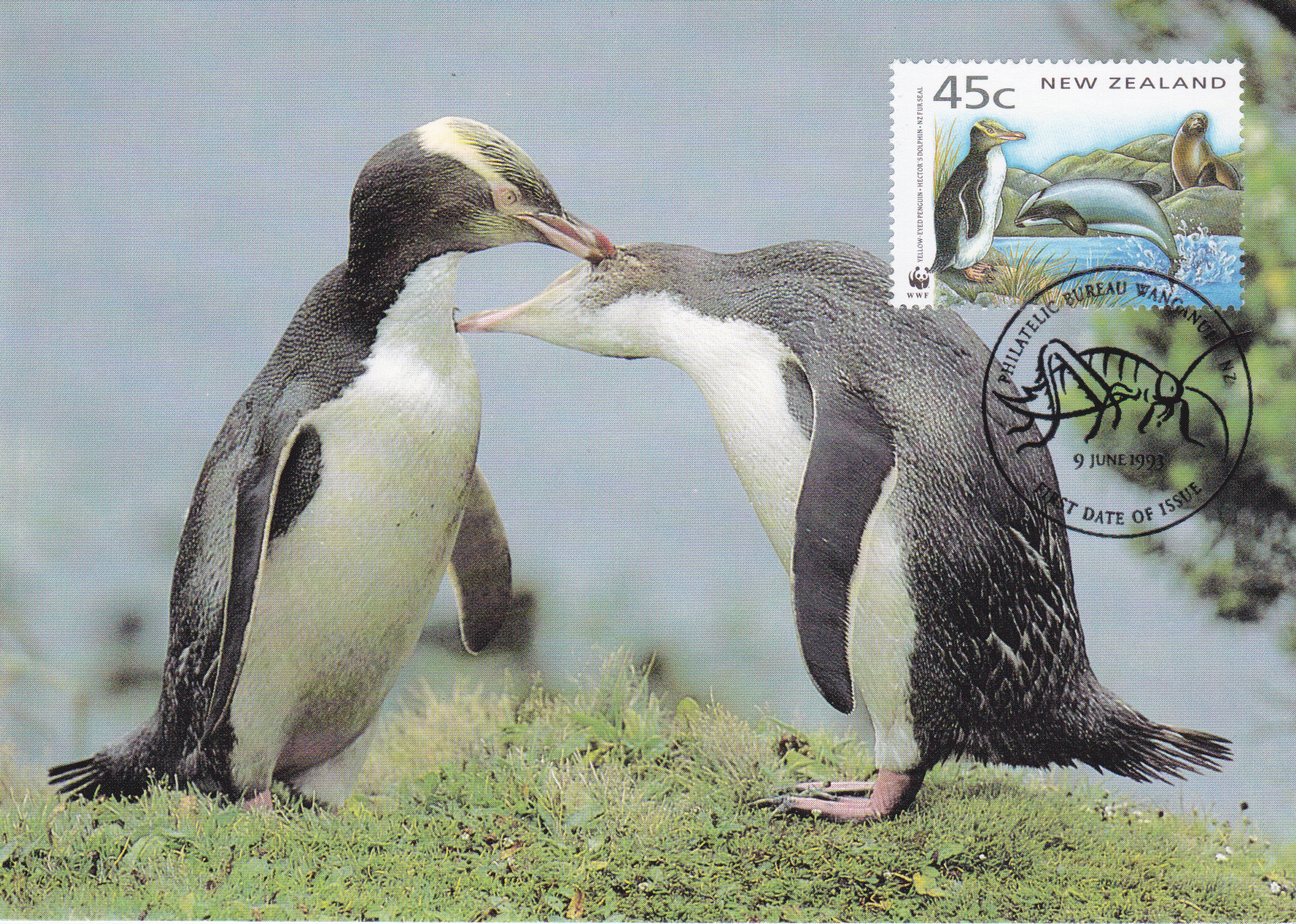 Aus Neuseeland kommt eine Marke (MiNr 1290) mit einem Gelbaugenpinguin (Megadyptes antipodes), einem Hectordelphin (Cephalorhynchus hectori) und einem Australischen Seebär (Arctocephalus forsteri).