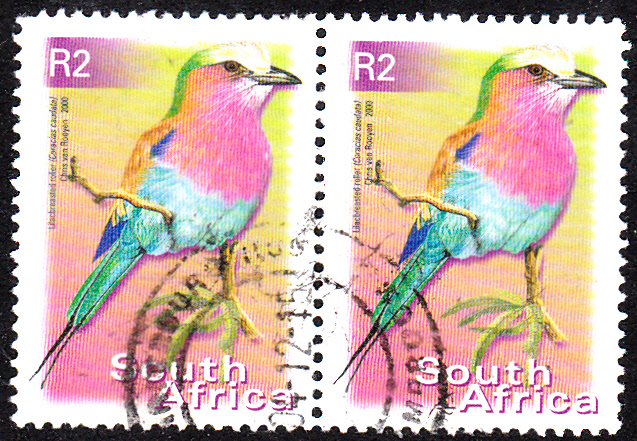 In Südafrika erschien in einer Freimarkenserie "Flora und Fauna" eine Marke (MiNr 1304) mit der Abbildung einer Gabelracke (Coracias caudatus). Hier ein waagerechtes Paar: