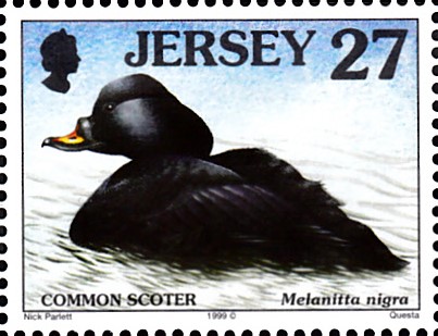 Eine Marke aus Großbritannien-Jersey (MiNr 897) zeigt eine Trauerente (Melanitta nigra).
