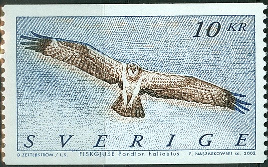 Eine schwedische (Rollen)Marke zeigt einen Fischadler in der Luft.