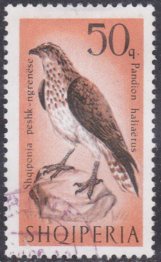 Auf dieser Marke aus Albanien (MiNr 1128) wird ein Fischadler (Pandion haliaetus) abgebildet.