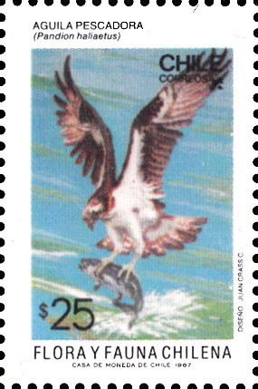 Aus Chile kommt diese Marke (MiNr 1194) mit einem Fischadler (Pandion haliaetus) mit Beute.