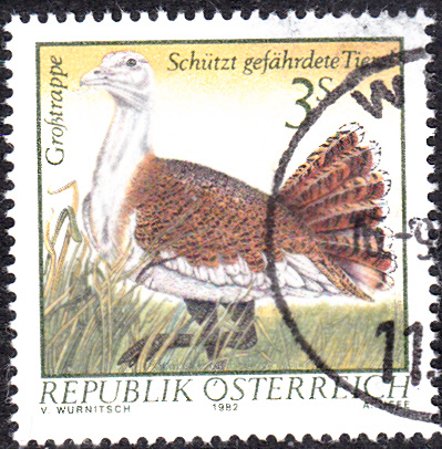 Aus Österreich kommt diese Marke (MiNr 1717) mit einer Großtrappe (Otis tarda).