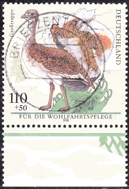 Die Wohlfahrtsmarken 1998 der Deutschen Post hatten Motive zum Thema "Bedrohte Vogelarten".Hier eine Marke zu 110+50Pf mit der Abbildung einer Großtrappe (Otis tarda).